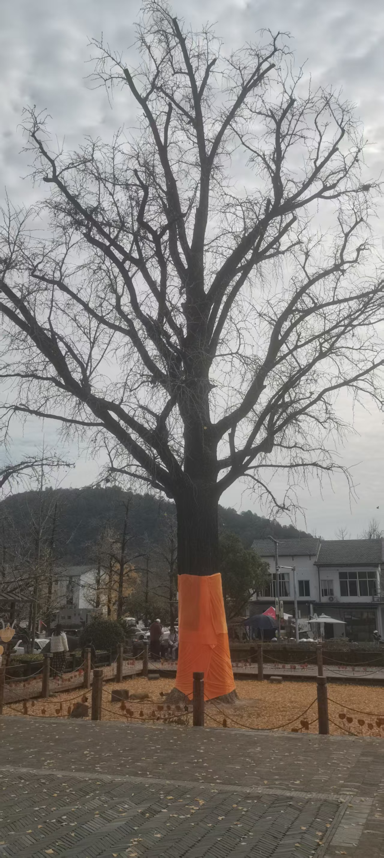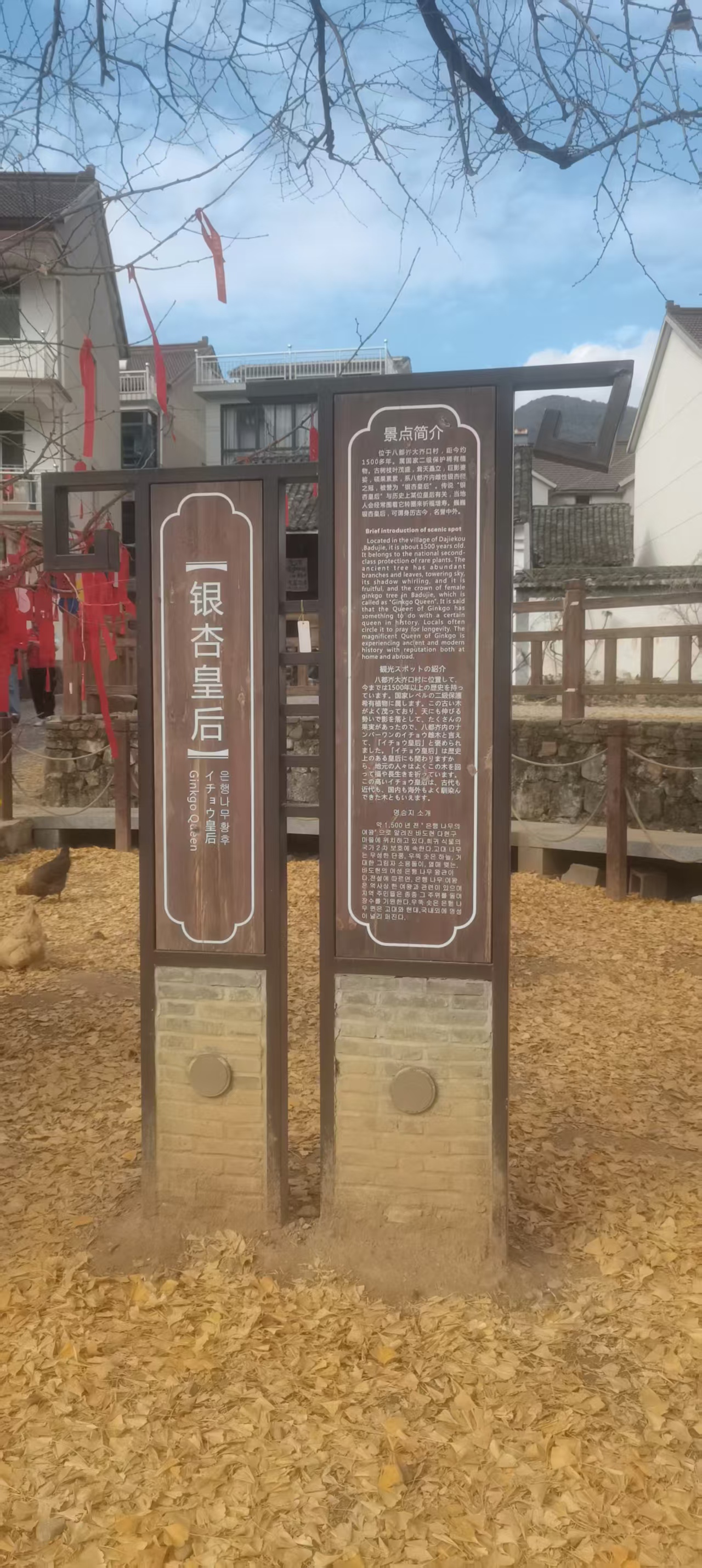 辞别雄健的“银杏王”,顺着长廊向更幽静的岕内走去,空气愈发清润。第二站,是深藏于大岕口村的“银杏皇后”。她的年岁更为悠长,已达一千五百一十年,是这片土地上当之无愧的尊长。与“王”的阳刚气概不同,“皇后”的姿容是雍容而丰茂的。她耸天矗立,巨影婆娑,至今仍能硕果累累,展现着不息的生命力。当地流传,她的身世与陈朝(南北朝时期)的某位皇后有关,因而村民们常怀敬畏,在树下举办祭祀活动,祈求福寿。她是国家一级保护的稀有古树名木,是林木资源中真正的瑰宝。站在她的荫蔽下,那股凉意是更为沉静、更为内敛的,仿佛能触到南北朝以来无数个秋天积累下来的体温,厚重得让人屏息。