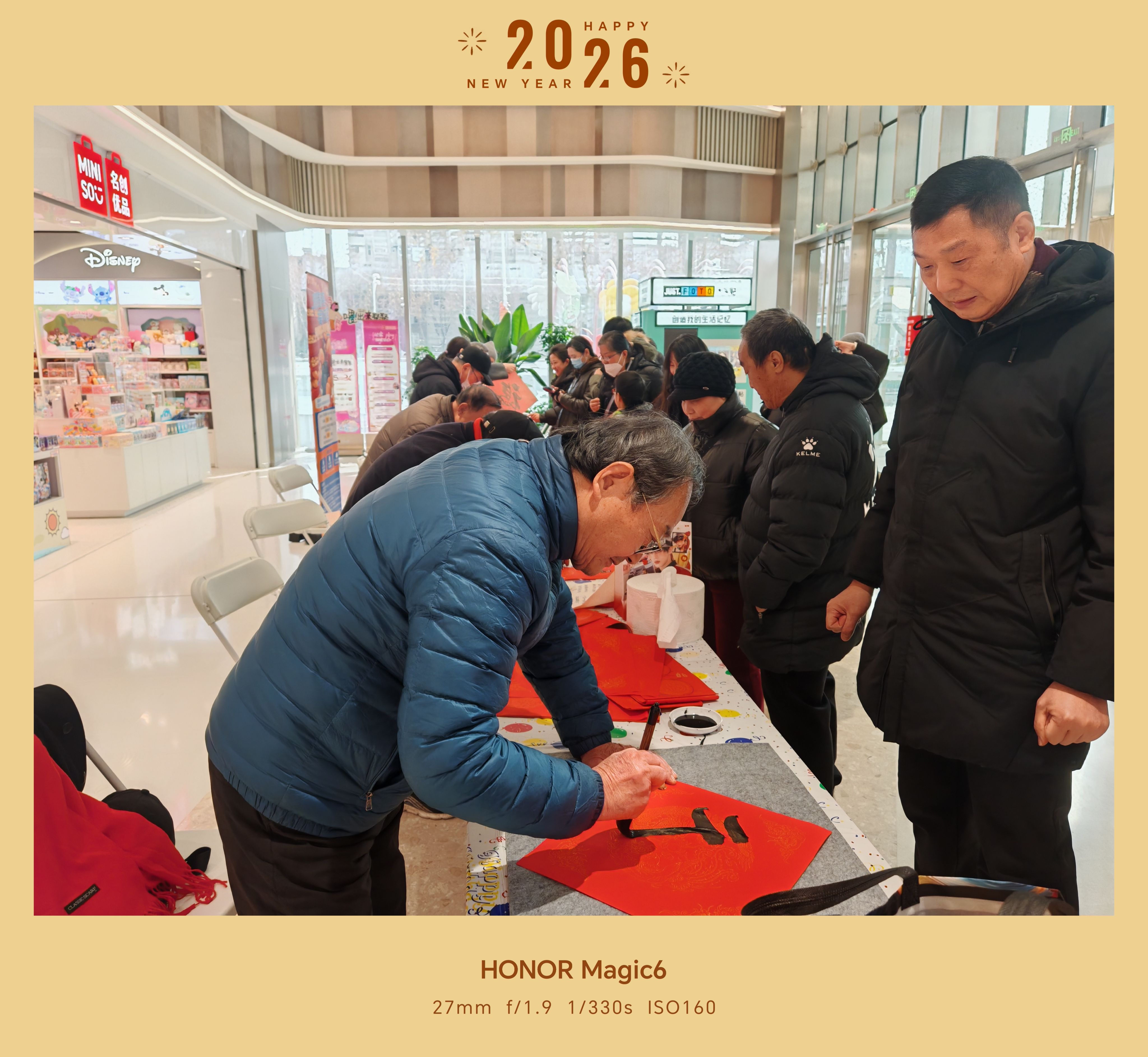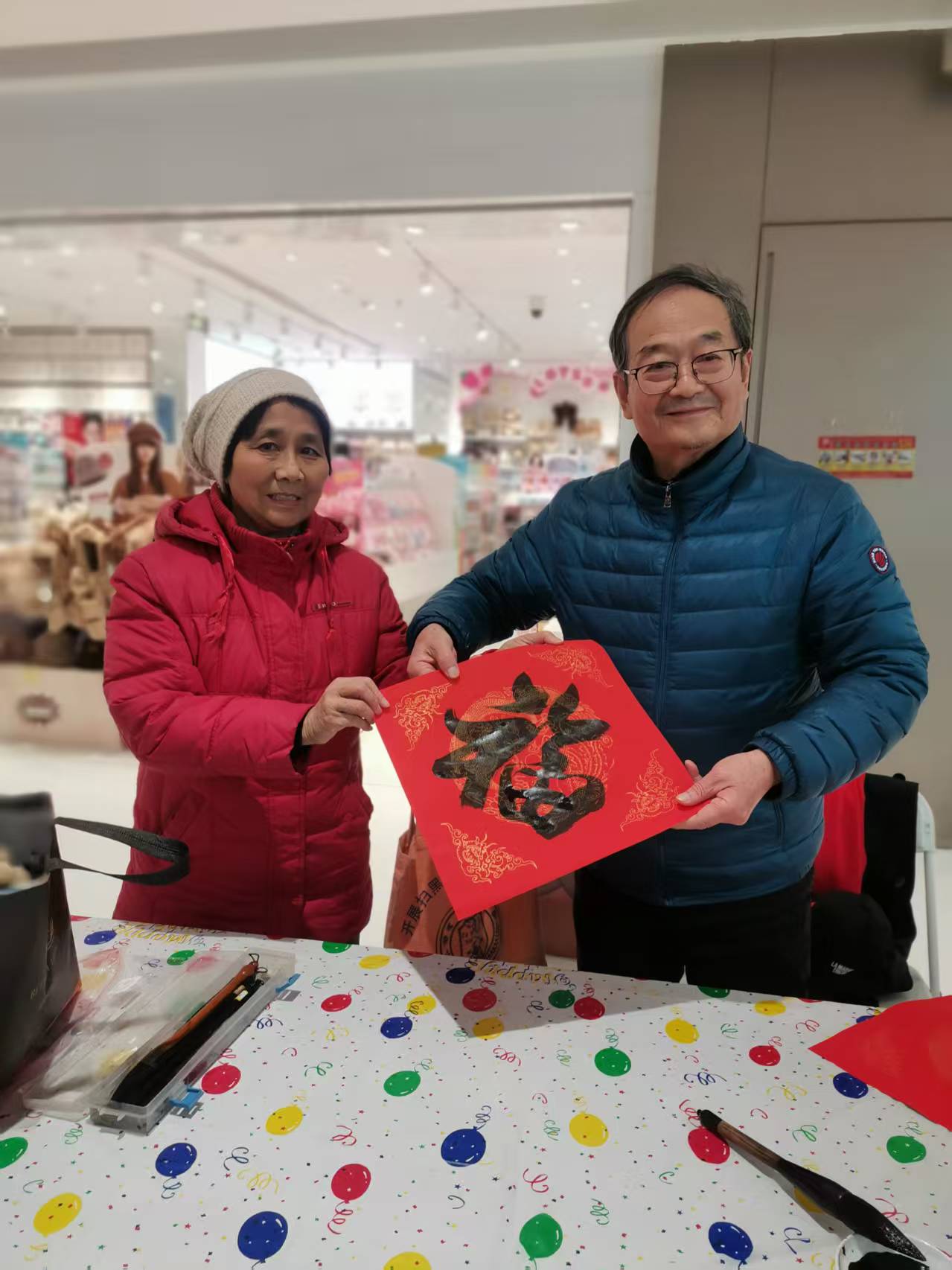 我校退休教职工参加本次活动,热情为居民和顾客撰写春联。